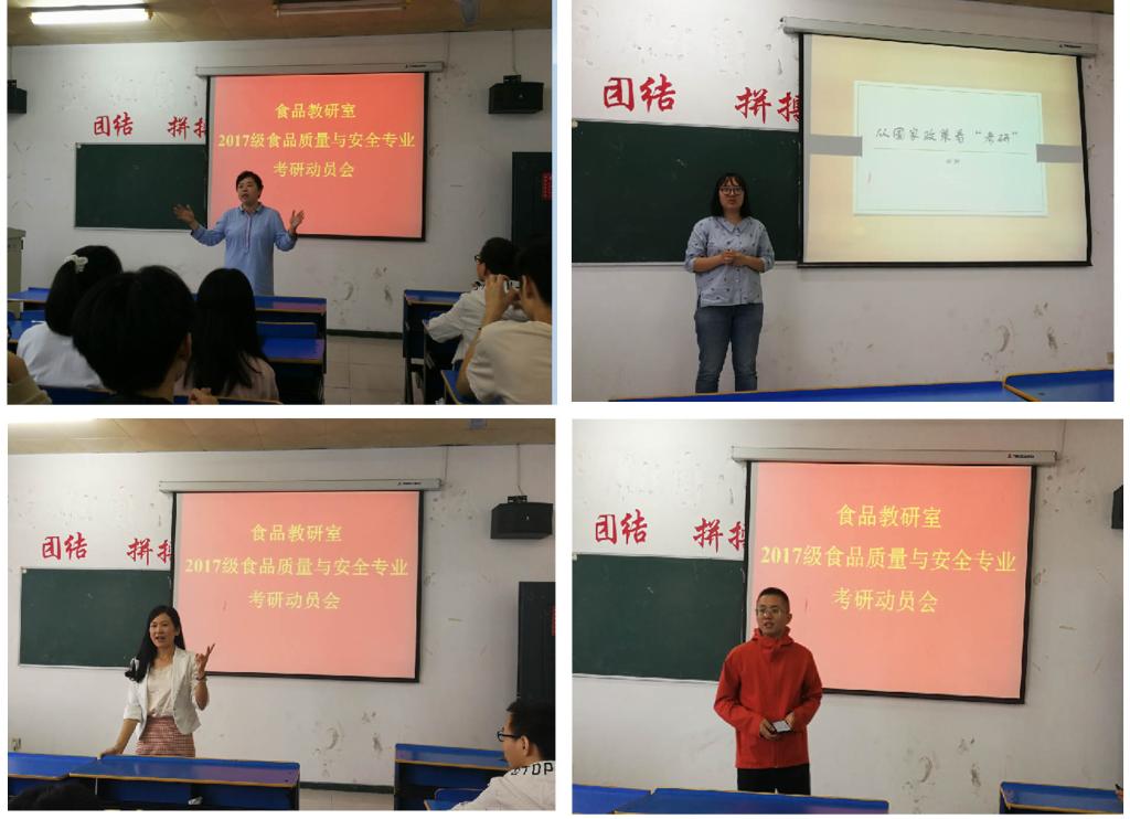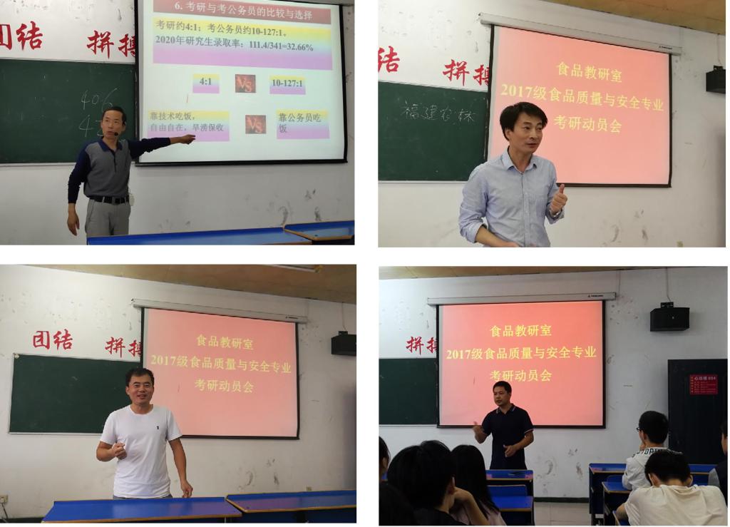 为进一步提高食品质量与安全专业2017及2018级同学报考研究生的热情及录取率,2020年9月17日上午9:00-11:30,食品教研室全体教师在心远楼604举办考研动员交流会。本专业2017级全体同学及2018届尚未决定考研的同学参加了此次会议。
