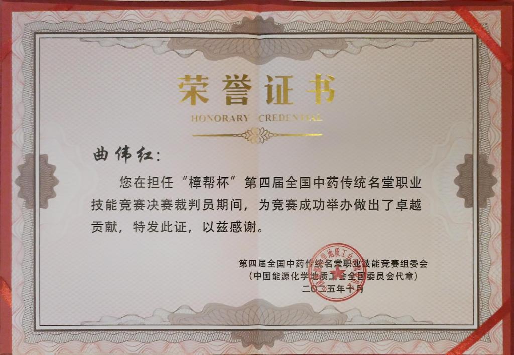 2025年10月28日至30日,“樟帮杯”第四届全国中药传统名堂职业技能竞赛在江西药都樟树成功举办。本次竞赛由中国能源化学地质工会全国委员会、江西省总工会、宜春市人民政府、江西省中医药管理局联合主办,宜春市总工会、樟树市人民政府承办,樟树市总工会、江西樟树中医药职业学院协办。我院药学与生命科学学院曲伟红副教授受邀担任本次大赛实操项目“水泛丸制作”赛项的裁判。