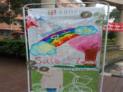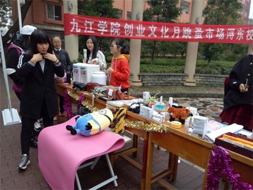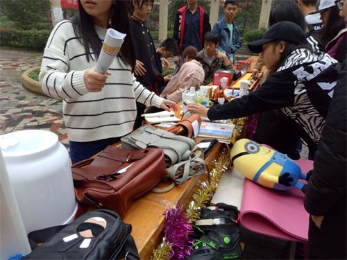 参加活动的同学们早早地聚集在欧风园,张贴好他们亲手设计绘画的海报和横幅,欢迎着每一位路过的人。桌子被整齐的摆放成一条直线,桌面上按类别分开放置了各种物品,每一个物品上都用便利贴贴上了相应的价格。“跳蚤市场”顾名思义是对二手的旧物品的售卖,参与者们走访各寝室收集同学们不需要但可以再利用的东西,包括皮包,文具,书本,护肤品,饮水机等商品,还有他们精心制作的手工艺品。参与者们满怀热情地招待吸引了很多同学的驻足,他们甚至准备好了水果,活动现场气氛融洽,同学们也用低廉的价格买到了自己需要的东西。