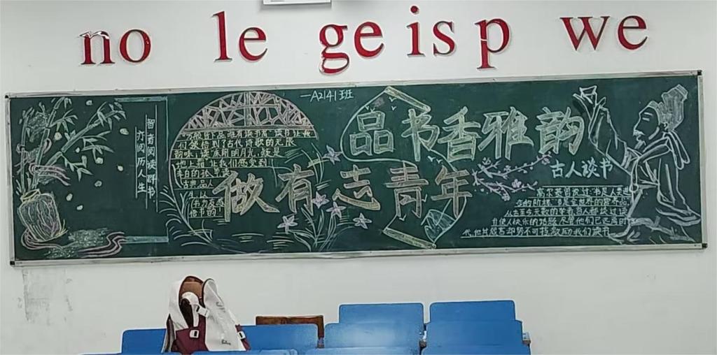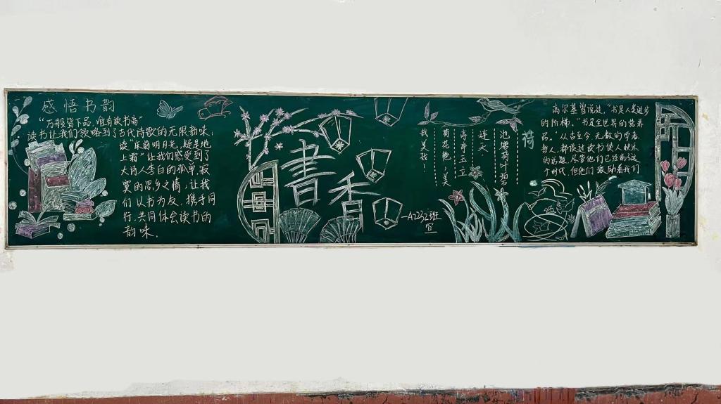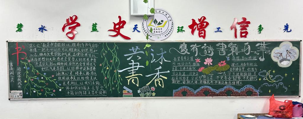 参赛班级的黑板报绘制作品各有千秋,绘画者情真意切,抓住“书香”一词,通过花朵,竹子,书本等意象化抽象为具体展现阅读带来的好处。