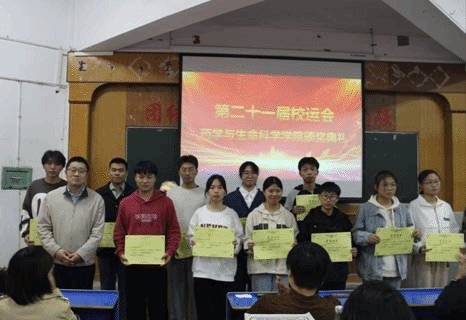 为表彰在第二十一届校运会上表现优异的运动员和突出工作者,鼓励运动员继续发扬体育精神,号召全体同学积极参与体育运动,提高身体素质,11月4日中午,药学与生命科学学院在笃学楼204教室举行第二十一届校运会表彰大会暨颁奖典礼。药学与生命科学学院党委副书记邓海波,学生科科长刘小风,思政科副科长陈慧君,学生会秘书长刘文佳及学生科辅导员老师出席本次大会,全体运动员、志愿者及各班代表参加,大会由学生会执行主席张佳怡同学主持。