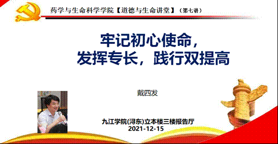 12月15日下午,药生学院 “道德与生命”讲堂第七讲邀请戴四发教授作为主讲嘉宾,做“牢记初心使命,发挥专长,践行双提高”主题报告。药生学院党委书记张国伟主持活动。