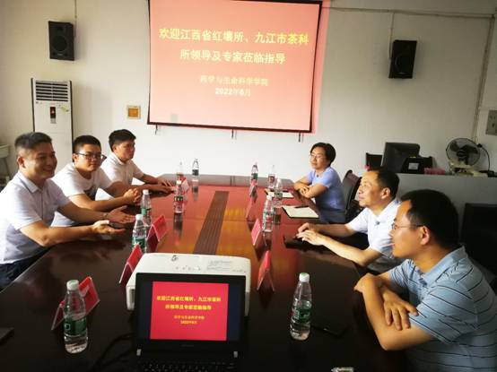 张小谷院长首先介绍学院科研团队、主要研究领域方向及研发条件平台情况,并表示学院全力为博士科研团队与科研院所、产业企业进行科研公关、合作交流创造条件。孙永明研究员感谢九江学院药生学院对合作研究的大力支持,姚丽萍博士作为江西省茶叶产业技术体系专家组成员,承担体系重点科研项目《夏秋茶提质增效关键技术研究》,目前该项目进展顺利,此次考察交流加深了对药生学院科研平台的了解,增强了合作信心,今后将以项目为依托,加强双方合作,联合申报省重点研发项目、联合申报省科技进步奖等,为江西省茶产业发展贡献更大力量。药生学院李同建、江西油茶研究中心高银祥等共同参加了交流座谈。