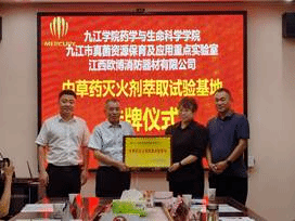 2022年7月5日上午,药学与生命科学学院与江西欧博消防器材有限公司在都昌县都昌镇人民政府举行“中草药灭火剂萃取试验基地”揭牌仪式。九江学院科研处处长汪鑫、都昌县人大常委会副主任梅水荣共同为药生学院江西欧博消防器材中草药灭火剂萃取试验基地揭牌,药生学院院长张小谷、党委书记张国伟、副院长张化浩、都昌县及都昌镇相关职能部门负责人、江西欧博消防器材有限公司董事长谢国辉、九江市真菌资源保育及应用重点实验室及学院博士教师代表何刚、孙启彪、季晓红出席签约挂牌仪式。授牌仪式由都昌镇党委书记邵国华主持。