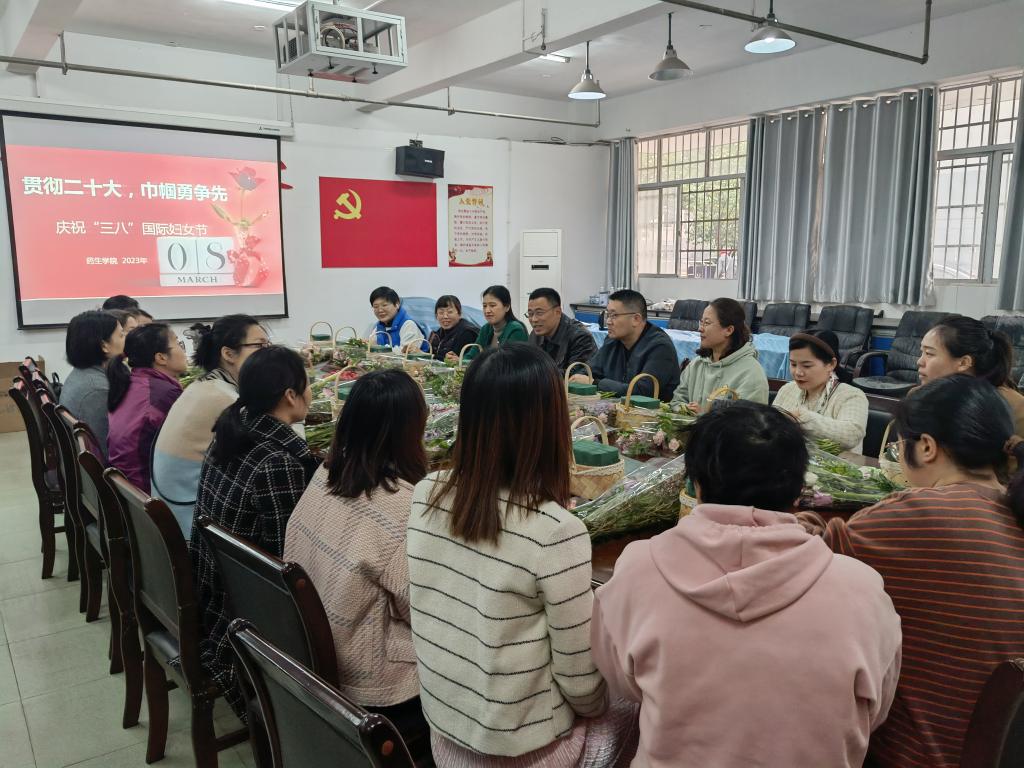 阳春三月,春意盎然。为庆祝第113个“三八”国际妇女节,陶冶教师情操,展示药生学院女教职员工优雅情怀、高超技艺和良好精神面貌,2023年3月8日上午,药生学院在浔东校区华文楼105举办了“贯彻党的二十大,巾帼勇争先”座谈会及花艺活动,药生学院近30名女教师参加了此次活动。学院党委书记张国伟和副书记邓海波同志出席本活动。