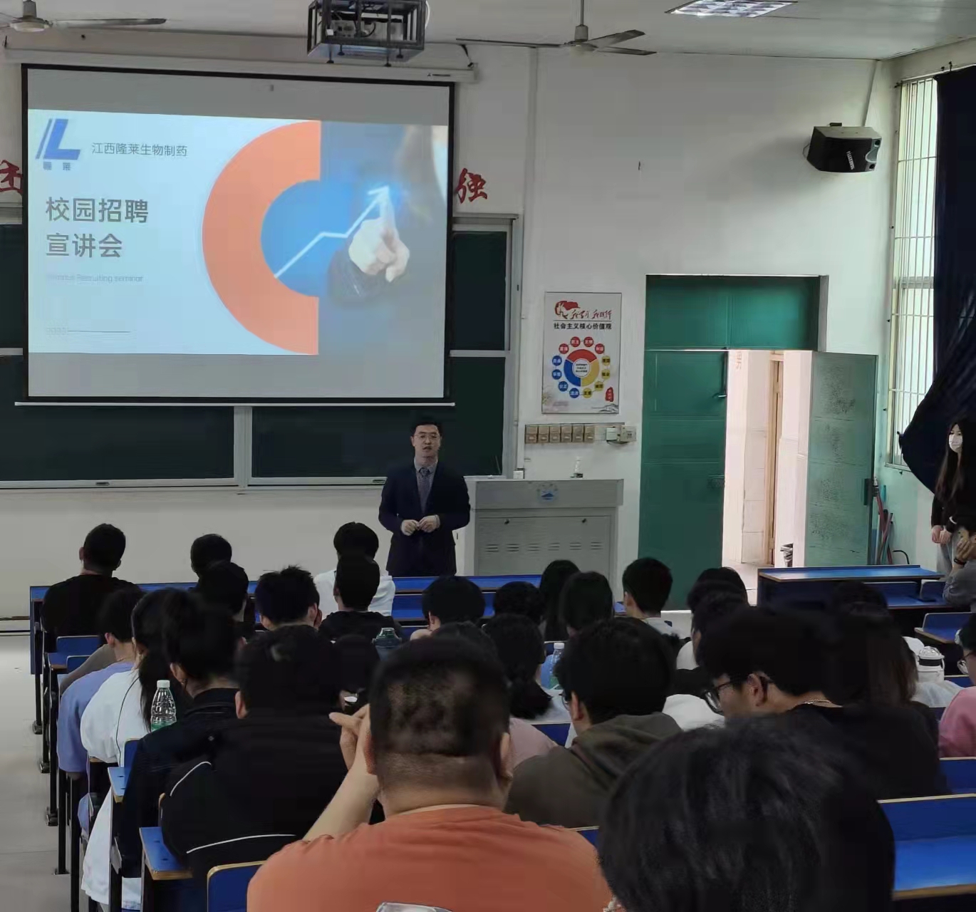 被邀请人江西隆莱生物制药有限公司人事经理陈波进行了宣讲,他从以下三个方面当代背景下毕业生去向及选择、校园招聘、职场理念进行了精彩的宣讲。