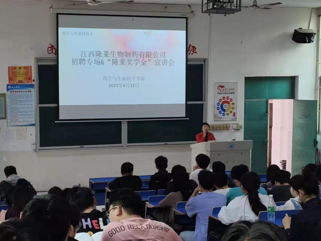 为了给2023届毕业生提供更多就业机会、让2024届毕业生对未来就业做好规划,药学与生命科学学院特邀江西隆莱生物制药有限公司4月12日下午2:30于思贤楼阶梯教室二召开招聘专场&“隆莱奖学金”宣讲会,大三大四学生参加会议,学生科副科长江英主持会议。