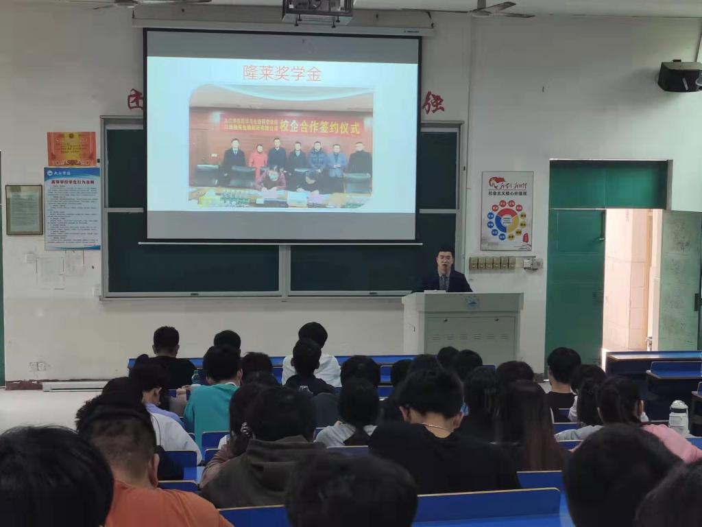 陈波介绍了隆莱生物制药有限公司的创始人、公司发展历史、涉及领域和公司未来发展规划,以及公司在九江学院药学与生命科学学院设立“隆莱奖学金”,鼓励更多生物医药专业大学生从事医药健康行业,为医药健康事业做出贡献。并鼓励优秀学子积极申请“隆莱奖学金”。