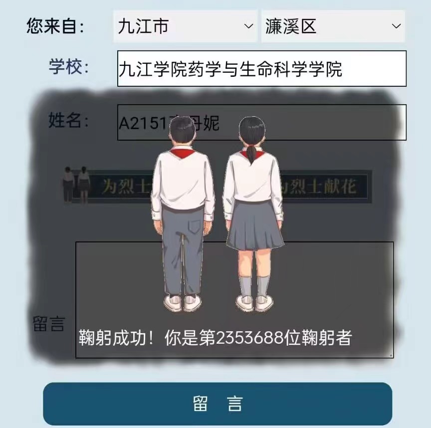 石可破也,而不可夺坚:丹可磨也,而不可夺赤;先烈已故也,仍永垂不朽。在清明当天,同学们纷纷通过“中华英烈网”、“文明江西”公众号等进入“清明祭英烈”专栏,浏览先烈们的英勇事迹,并进行献花、祭拜、留言来缅怀先烈的丰功伟绩,表达对革命先烈深深地哀思和崇高的敬意。