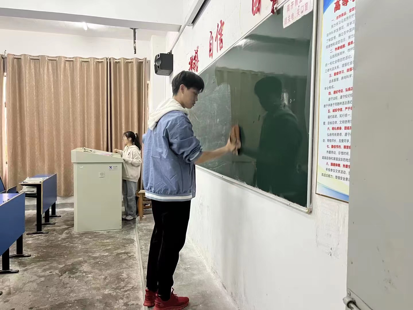 清明节寄哀思,鲜花一朵告天知。为深刻落实贯彻文明低碳扫墓,促进社会主义精神文明和生态文明建设,弘扬人文关怀,并且让同学们明白洁净天等人人参与,天等洁净人人受益的环保理念,同时践行“环保清明,校园同行”的志愿活动理念,在清明时期,药学与生命科学学院学生党支部开展了“环保清明,校园同行”主题党日活动,组织全体党员和入党积极分子对教室进行了义务劳动志愿活动,同学们在教室的每个角落都留下了劳动后最光荣,最可爱,最美丽的笑容。
