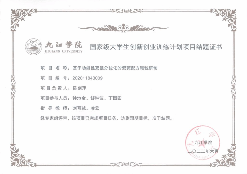 刘可越同志在中药研究方面获得多项课题资助,主持并完成国家自然科学基金2项、省部级、市厅级课题多项,于国内外公开发表论文40余篇,获得国家授权专利9项。研究成果曾获“江西省高校科技成果奖”、“中华医学会医学教育分会教学改革成果奖”,“九江学院优秀科研成果奖”等。同时,作为骨干成员积极参与九江市重点实验室“赣西北中药资源开发与利用重点实验室”的建设。并且,作为一名女性科技工作者,她深知女性做科研的不易,很多女科技工作者会陷入事业与家庭两难抉择中。为此,她组建了“蕙心兰质”药物技术研究团队,由12位女性组成,其中10位女博士。大家克服了重重困难,在科技创新中上取得佳绩,团队事迹在市妇联“ 九派巾帼红 建功新时代”首届女性短视频大赛中进行展播。