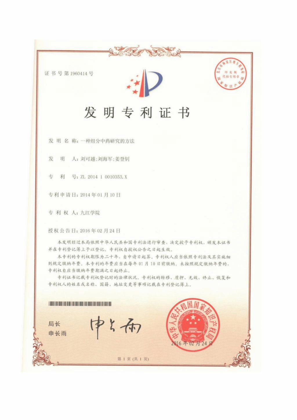 习近平总书记两次视察江西期间,对我省中医药产业发展提出了殷切希望。党的二十大报告明确提出要“促进中医药传承创新发展”。九江地区各类中药资源十分丰富,如何充分利用地方本草资源,具有十分重要的意义。为促进我市中医药产业发展,多年来,刘可越同志致力于药用植物资源的挖掘和中药炮制的研究。针对目前中药药效物质基础不明确的瓶颈问题,刘可越老师经过多年研究, 首创“入血成分追踪法”,联合应用各种现代技术,获得可入血生效的真正的"活性成分"。并将“入血成分追踪法” 进行“组分中药”研究的手段申请国家发明专利,已获得授权,为中药药效物质基础的研究提供了新的思路和研究方法。研究成果获得江西省高校科技成果三等奖。