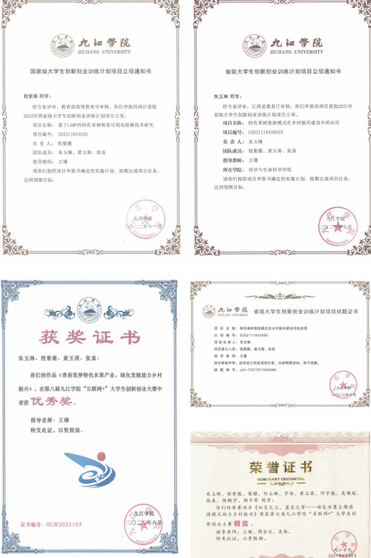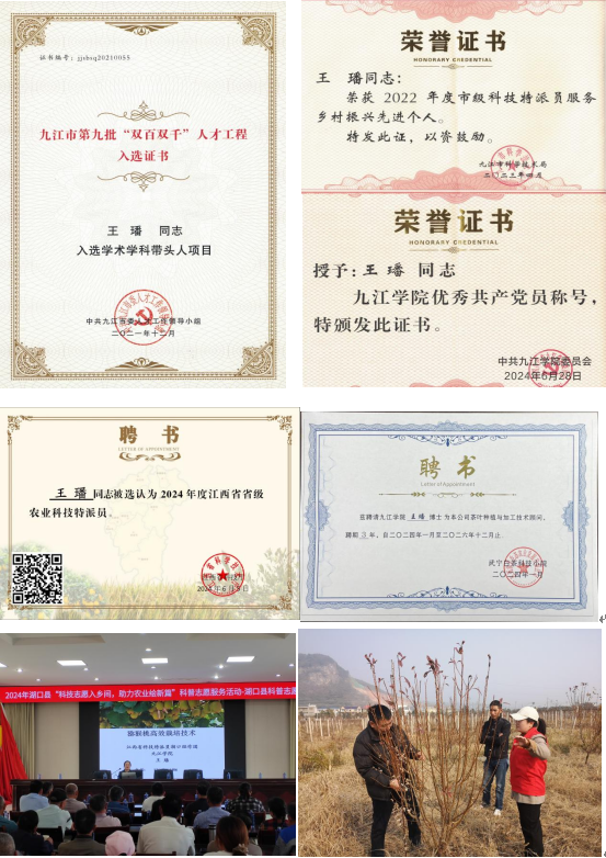 通过长期的努力与坚持,科技服务与合作取得成效。联合企业申报并立项九江市重点研发计划项目《赣北特色果树绿色提质增效技术研究与示范》、《优质多抗有机蓝莓高产栽培及病虫害防治研究》;经过技术培训,柴桑区金露生态农业发展有限公司法人吕鹏入选市“双百双千”人才工程“农村实用人才”培养计划。相关工作也获得市主管部门和基层服务对象的认可,该同志入选2022-2024年省科技特派员、2020-2021市科技特派员,2022年入选市第九批市“双百双千”人才工程“学术学科带头人”培养计划,2023年被评为“市级科技特派员服务乡村振兴先进个人”,主要事迹被推荐为2023年“江西省科技特派员典型案例”;进驻的“武宁白茶科技小院”入选2024年首批省级科技小院以及推荐第五批中国农技协(江西)科技小院创建名单。