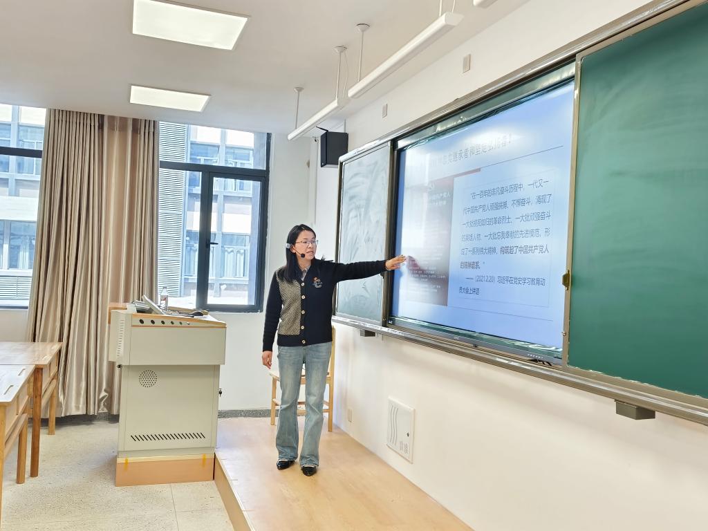 石红璆以新时代大学生如何弘扬中国精神这一问题导入本次课程主题。具体讲述了“什么是精神”、“精神的作用”,以电视剧《觉醒年代》中辜鸿铭先生关于中国人精神的观点引发了学生关于中国精神的深入探讨。从中国人物质生活与精神生活相互关系的独到理解、对理想的不懈追求、对品格养成的重视程度三个角度分析了中华民族自古以来崇尚精神的优良传统和对人的精神世界的高度关注。重点引用红旗渠精神、抗疫精神,讲述了中国精神的丰富内涵,并以随堂练习的方式进行巩固深化。在讲述谁是中国精神的忠实继承者和坚定弘扬者时,石红璆通过播放短视频回顾了中共一大的故事,通过例举李大钊、彭湃、陈延年、陈乔年、刘启耀等革命先驱爱国历程,诠释了中国共产党始终坚持真理、坚守理想,践行初心、担当使命,不怕牺牲、英勇斗争,对党忠诚、不负人民的伟大建党精神;详细讲解了百年党史中一批批视死如归的革命烈士、一大批顽强奋斗的英雄人物、一大批忘我奉献的先进模范所构筑起的中国共产党人的精神谱系。