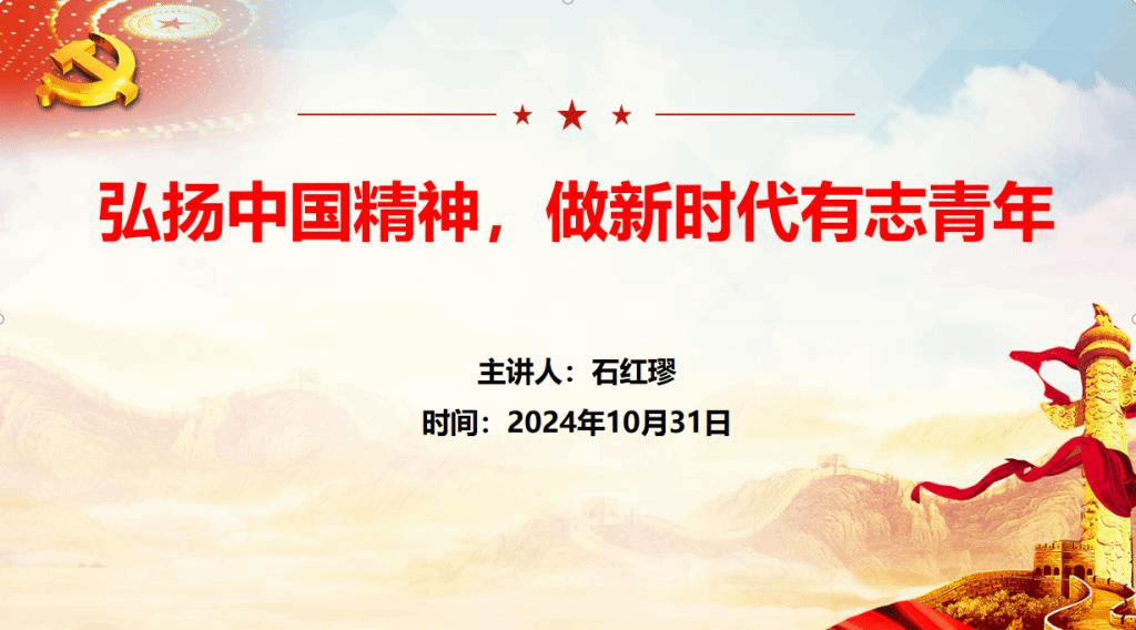 此次党课主要围绕中华民族如何崇尚精神、如何理解中国精神、谁是中国精神的忠实继承者和坚定弘扬者、新时代青年为实现中国梦如何弘扬中国精神四个方面依次展开。