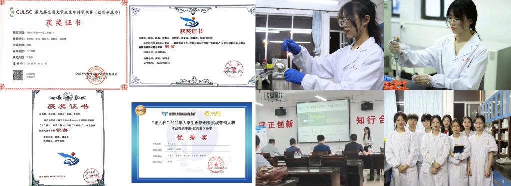 在课堂学习之外,她会认真对待每一件事情,积极参加科研竞赛活动。跟随课题组老师潜心科研,多次以项目负责人身份带领团队同学参加学科竞赛,在实践中不断丰富和锻炼自己的专业能力。“既然要做,那就要做好。”她深知每一件事情的成功背后都需要付出巨大的努力,所以她从未放弃。在共同努力下获“第九届全国大学生生命科学竞赛”创业组全国三等奖,九江学院第八届、第九届创新创业“互联网+”大赛取得校级银奖及铜奖。