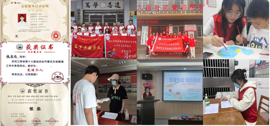 每年假期期间,她秉持社会责任,积极参加社会实践和志愿服务,累计服务时长达150余小时。在“疫情防控排查”活动中,她为营造居民安全健康的生活环境而服务。在学校防控疫情期间,统筹安排值班学生干部人员,齐心协力防控疫情,为师生提供安全的学习生活环境。“文明交通”志愿活动中,她积极表现,维持交通秩序,共创文明社会。暑假期间,她与老师和同学一同参加暑期“三下乡”实践活动,共同实地调研乡村振兴,帮扶乡村儿童,获人民日报、江西思政媒体报道8篇。在九莲社区提供志愿服务站点,开展“走进社区,助力双减”志愿项目,响应双减政策的落地实施。在江西省第十六届省运会召开期间,她带领学院啦啦操演职人员出色完成省运会开幕式表演。
