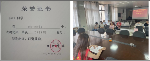 她注重学习效率,讲求学习方法,有一定的自觉性,懂得时间分配与合理规划,勤奋与努力使她的成绩优异,在历次考试中均名列前矛,多次荣获九江学院二等奖学金并顺利通过了大学英语四六级考试、计算机二级考试和普通话等级测试。在2022-2023学年荣获国家励志奖学金和“勤奋学习标兵”称号。