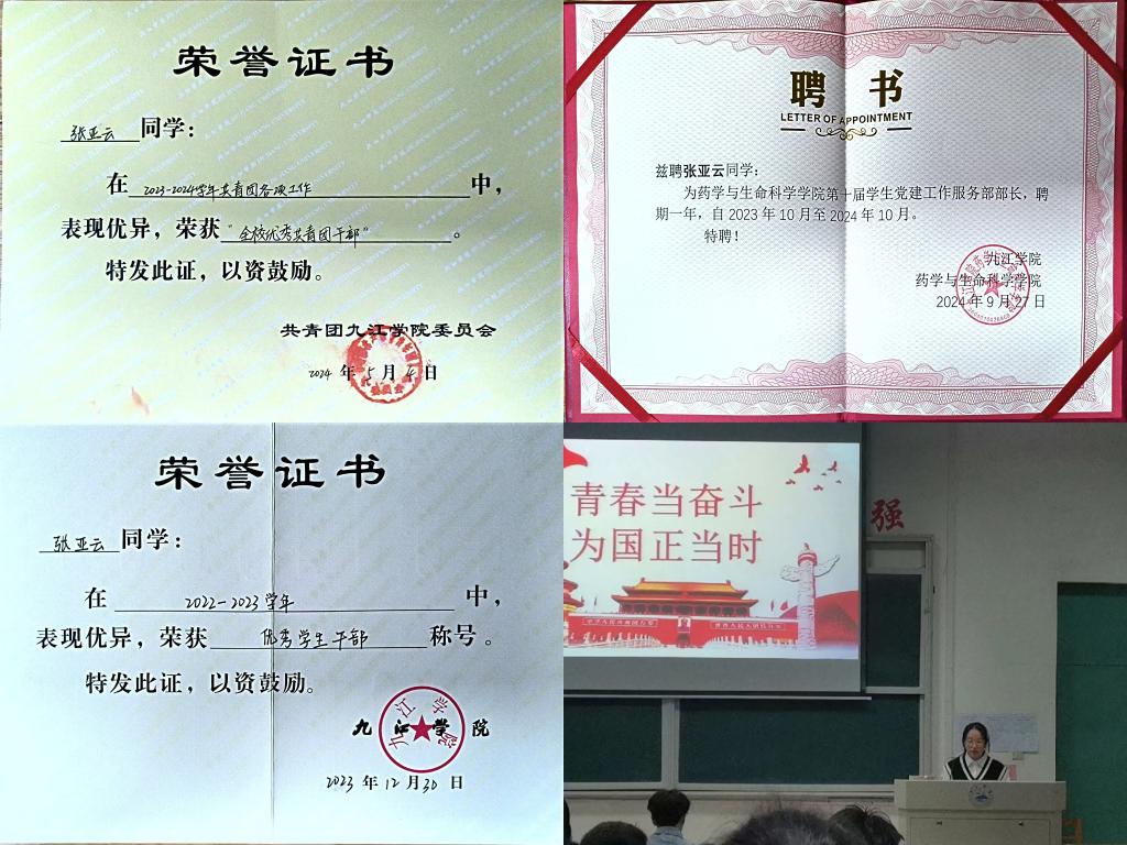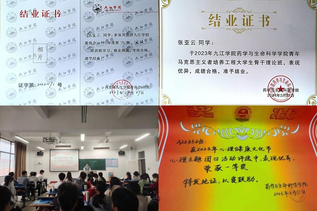 “努力深耕自己的能力,勇敢面对竞争。”这是她不断鼓舞自己的话。在进入大学,本着提升自身能力,努力为班级服务的宗旨,张亚云成为了团支书。她始终保持着认真负责的态度完成各项工作,以身作则,积极开展主题团课和督促班级同学完成青年大学习,并多次荣获“团日活动PPT”优秀班级,班级“心理比赛主题团日活动”一等奖。同时,张亚云参加共青团九江学院委员会2022年度第九期团校培训班和九江学院药学与生命科学学院青年马克思主义者培养工程大学生骨干理论班,并作为“优秀小组”称号。