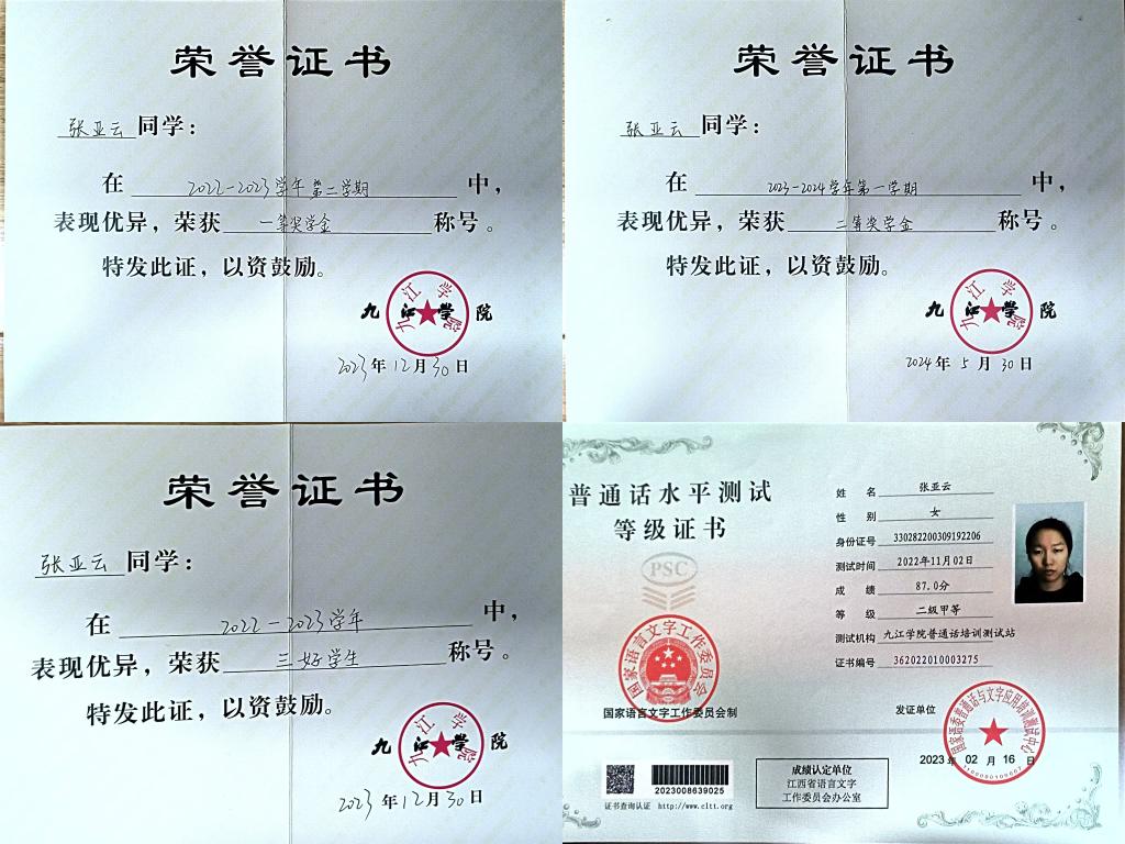 张亚云不仅注重专业知识的学习,还积极参加各种比赛、创新创业训练项目等活动。在校期间,她积极参与比赛,提升个人综合素养,荣获校级“国家安全教育征文大赛”一等奖、校级“非凡成就铸辉煌,踔厉奋发担使命”征文比赛三等奖,院级征文比赛一等奖和二等奖,学院视频比赛二等奖和三等奖等荣誉。她进入实验室后,努力认真进行科研实验,并作为第一作者成功申报省级大学生创新创业训练项目。