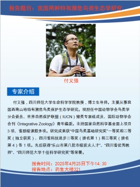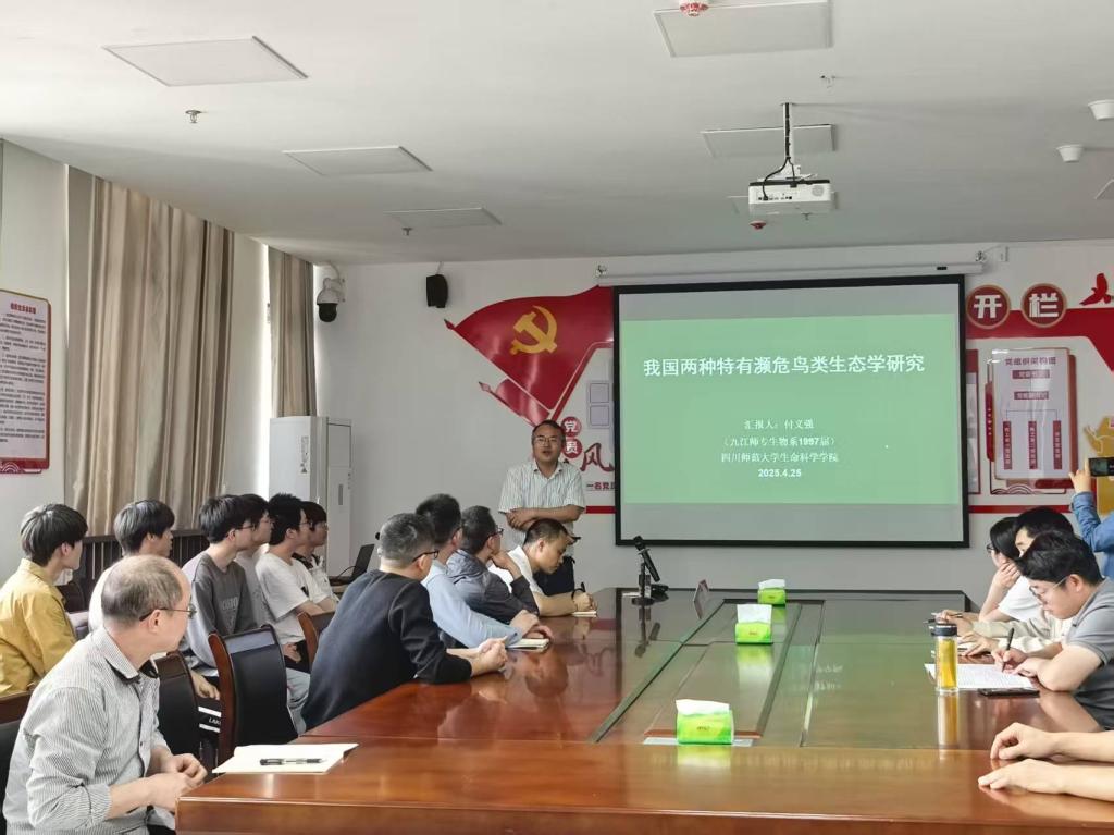 4月25日下午,药学与生命科学学院邀请四川师范大学生命科学学院教授、博士生导师付义强教授在紫薇园药生楼321会议室举行题为《我国两种特有濒危鸟类生态学研究》的专题学术讲座。学院生物科学教研室教师代表和2023级生物科学专业部分本科生聆听了本次讲座,讲座由副院长何刚主持。