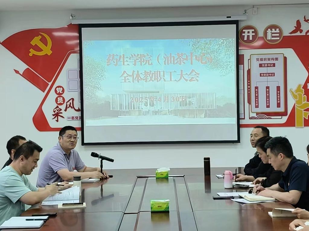 4月30日下午,药生学院(油茶中心)召开全体教职工大会,会议由党委副书记邓海波主持。会议集中学习《习近平关于加强党的作风建设论述摘编》《习近平总书记关于党的建设的重要思想概论》。会议传达学校2025年党建工作领导小组会议精神、2025年度平安建设暨安全生产工作会议精神。会议学习九江学院2025年师德师风建设月报(第四期),通报教育领域及九江市违反中央八项规定精神的典型案例,会议观看了2025年保密公益宣传片《指尖的守护》。