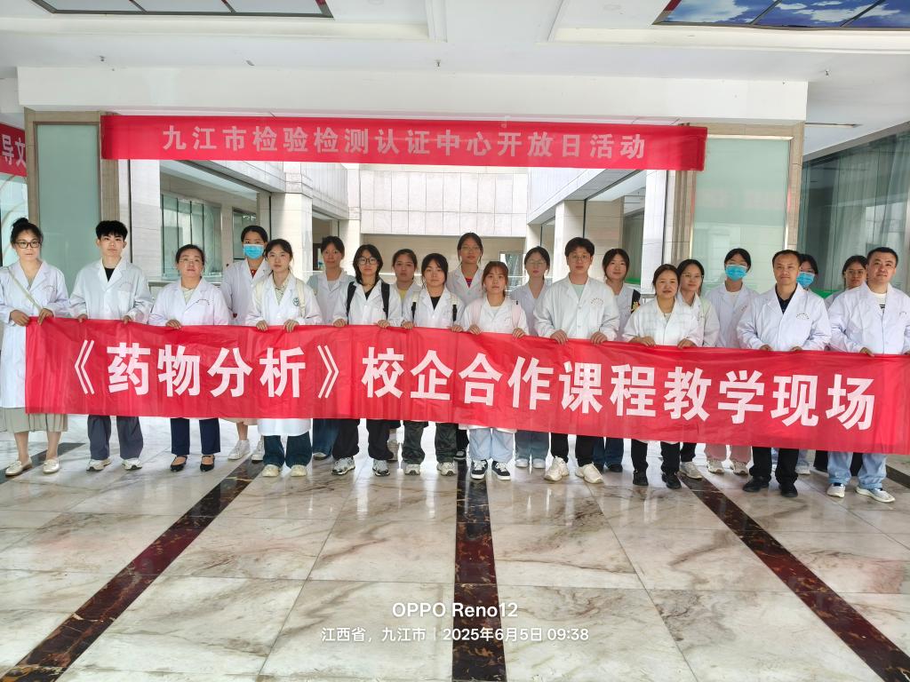 为深入推进产教融合协同育人机制,推动《药物分析》校企合作课程建设,提升学生的专业实践能力与职业素养,2025年6月5日,在药学与生命科学学院药学教研室主任、《药物分析》课程团队负责人姜登钊老师带领课程教学团队骨干教师任锦、姚丽萍与2023级药学专业优秀学生代表前往九江市检验检测中心食品药品检测分中心开展现场教学。学院副院长何刚全程观摩教学活动。