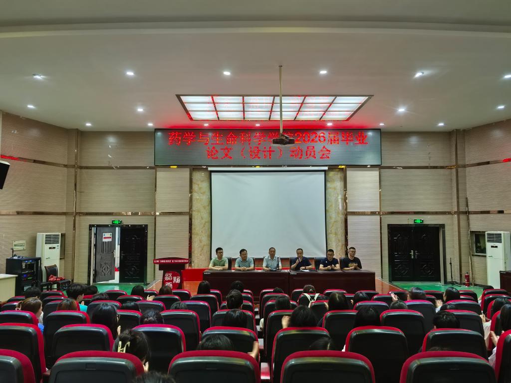 为进一步落实应用型人才培养目标,规范毕业论文(设计)过程管理,强化学术诚信教育,不断提高我院毕业论文(设计)完成质量,6月15日下午,药学与生命科学学院在香远楼学术报告厅召开2026届本科毕业论文(设计)动员大会,学院院长张小谷、副院长何刚、教学科研管理科负责人、各教研室主任(副主任)、2022级各班班主任和2022级各专业共8个班全体学生参会,会议由副院长何刚主持。