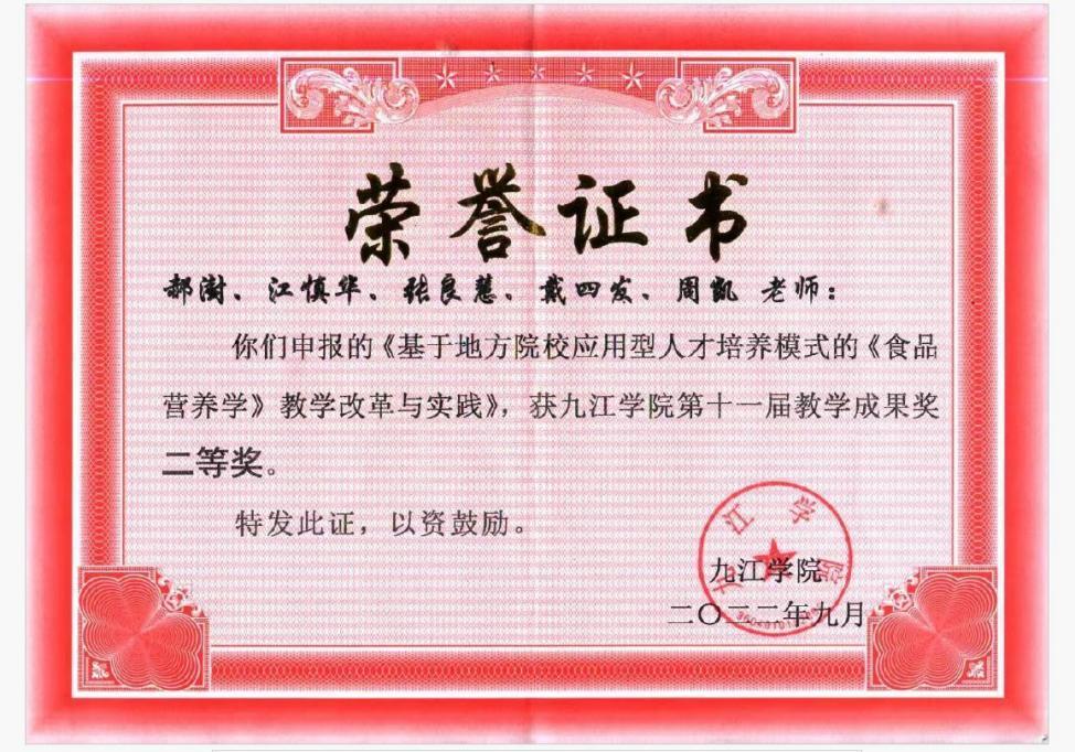 郝澍联合食品教研室全体成员独创“三阶递进”育人模式:大一阶段通过学业导师制度明确发展目标,大二阶段推行“考研伙伴计划”构建学习共同体,大三阶段组织“真题攻坚营”强化应试能力。她高度重视学生科研能力培养,推动80%学生于大一即参与科研项目,最终实现国家级竞赛获奖9人次、学术论文及专利成果4人次。其主持的江西省高等学校教学改革研究课题(2022年结题)与校级应用型课程《食品营养学》(2024-2026)建设,为育人体系提供坚实理论支撑。