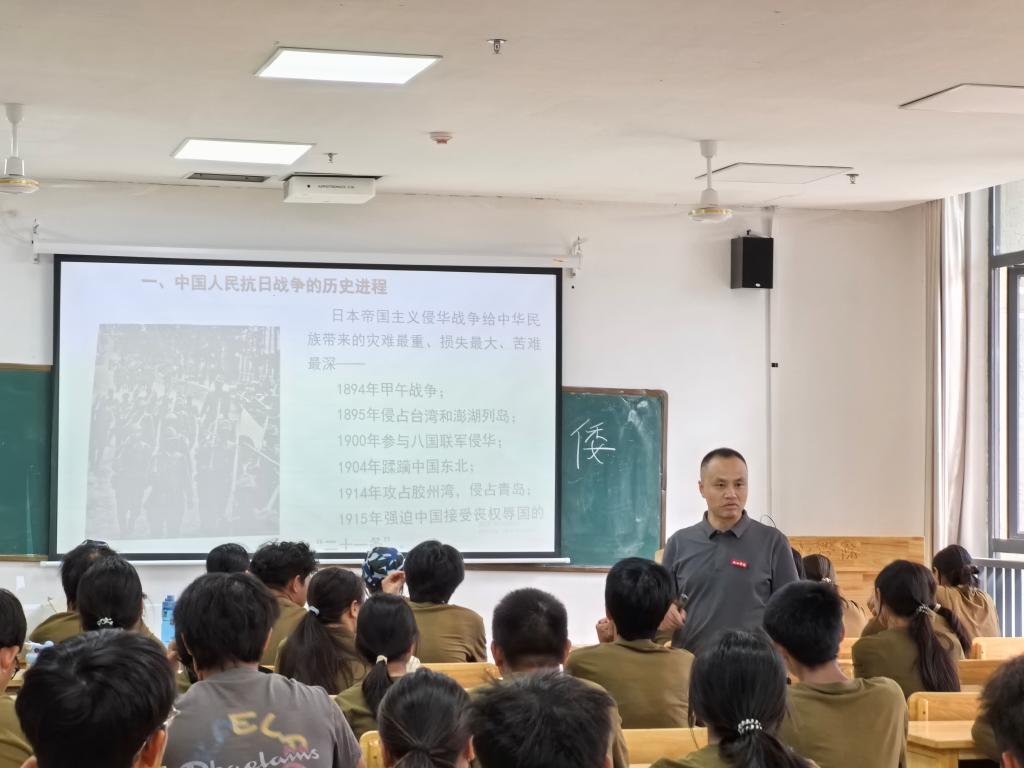 课堂上,雷志强以纪念中国人民抗日战争暨世界反法西斯战争胜利80周年的切入点,从“中国人民抗日战争的历史进程”“中国共产党在抗日战争中发挥了中流砥柱作用”“中国人民抗日战争的历史意义”“抗战精神的历史启示和时代价值”等四个方面解读了伟大抗战精神,并通过大量详实数据和生动案例,为全体新生上了一堂深刻生动、催人奋进的思政大课。勉励同学们要从抗战精神中汲取奋进力量,将个人理想融入民族复兴的伟大事业,以史明志,以学增慧,以行践诺,在新时代新征程中书写无愧于先烈、无愧于时代的青春篇章。