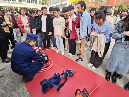 讲话结束后,志愿消防员邀请师生参观消防知识展板,观摩消防装备及参加实操演练,并分发消防教育宣传手册,讲解消防安全常识及火场逃生自救技巧,并现场演示了灭火器、消防栓等常用消防器材的正确使用方法。