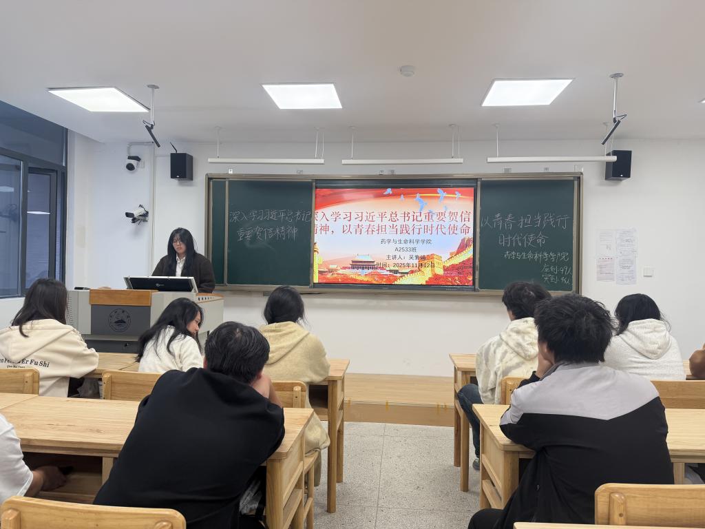 为深入学习贯彻习近平总书记致全国青联十四届全委会和全国学联二十八大的重要贺信精神,引导广大团员青年坚定理想信念、厚植家国情怀,药学与生命科学学院举办了以“学习习近平总书记重要贺信精神,以青春担当践行时代使命”为主题的团日活动,旨在引导广大青年深入学习习近平总书记重要贺信精神。
