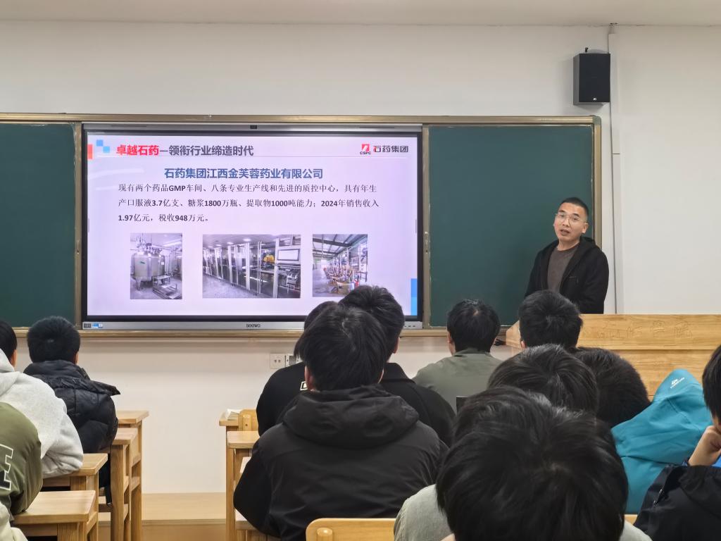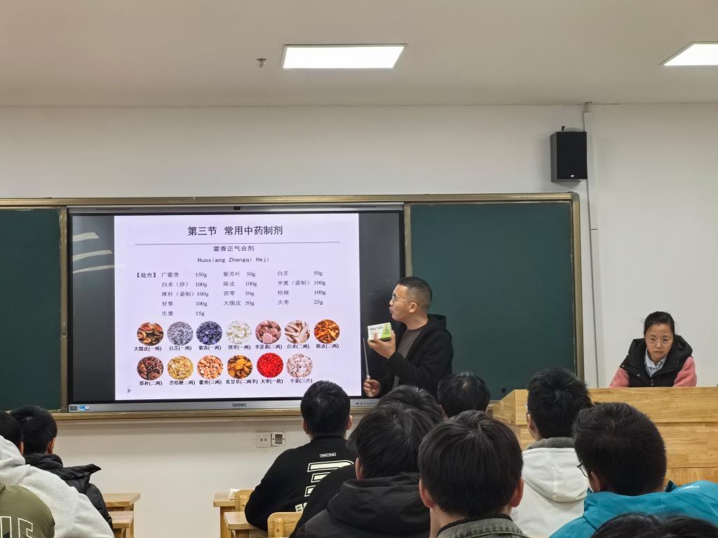 课堂上,杨燕欢副总经理凭借其丰富的企业管理与技术实践经验,围绕“现代中药制剂”主题,深入剖析了当前中药行业的发展现状与未来趋势,并重点介绍了石药集团江西金芙蓉药业有限公司的代表性产品和市场布局。他以企业拳头产品藿香正气合剂为案例,系统讲解了合剂这一中药制剂主流剂型的处方设计、工艺流程、关键生产设备及GMP车间运行规范,生动展示了藿香正气合剂从药材浸提到灭菌灌装的全流程,帮助学生直观理解药品工业化生产的实际操作与技术要点。张丽芳副教授以饱满的教学热情和富有感染力的语言,巧妙穿插互动提问,充分调动学生积极性,营造出活跃而专注的课堂氛围。两位教师优势互补、协同发力,将国家药品生产法规、行业政策导向、企业人才需求与思想政治教育有机融合,不仅传授专业知识,更传递职业精神与产业视野,真正实现了“知识传授+价值引领+能力培养”三位一体的育人目标。