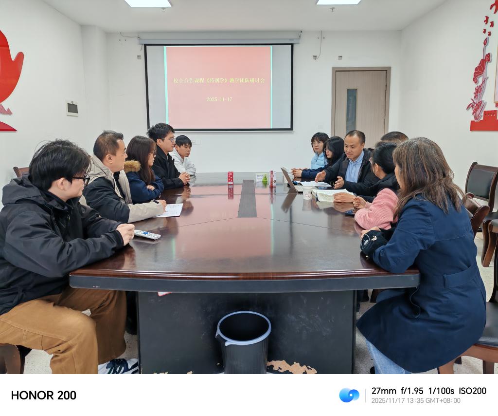 为保障本次校企联合授课质量,课前,副院长何刚与药学教研室主任姜登钊组织相关教师开展专题教学研讨,就课程内容设计、课件优化及教学实施细节进行充分打磨。课后,课程团队及药学专业师生代表召开教学评议会,围绕课程体系完善、教学模式创新及后续《药物分析》《生药学》等课程的校企共建路径展开深入交流。