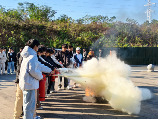 演练前,保卫处刘道澄以校园火灾常见诱因为切入点,系统科普火灾初期识别方法、不同场景逃生策略,重点强调“弯腰低姿、捂口鼻、不贪恋财物”的核心逃生原则,帮助同学们深化火灾风险认知。疏散信号响起后,教学楼模拟火情突发,同学们迅速响应,严格按照预设路线弯腰捂口鼻快速撤离,全程秩序井然,充分展现出良好的应急配合与处置意识。随后,刘道澄现场演示灭火器“提拔握压”完整操作流程,详解关键步骤。同学们分批次实操练习,从生疏到熟练,切实掌握了初期火情处置技能。