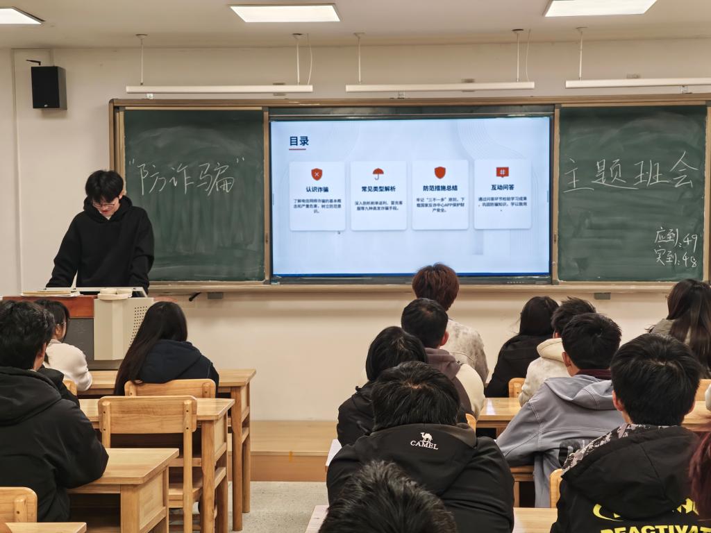 班会伊始,各班主讲人通过PPT 演示,结合真实案例,详细讲解了刷单返利、冒充客服退款、虚假购物、网络交友诱导投资(杀猪盘)、冒充公检法人员、校园贷陷阱等常见诈骗类型的作案手法与特点。随后的互动环节中,同学们围绕“如何识别诈骗信息”“遇到诈骗应如何应对”等问题展开讨论,并分享了相关经历,普遍表示将提高警惕,谨防上当。最后,主讲人强调了“不轻信、不透露、不转账”的原则,并提醒学生保护个人信息,及时求助。