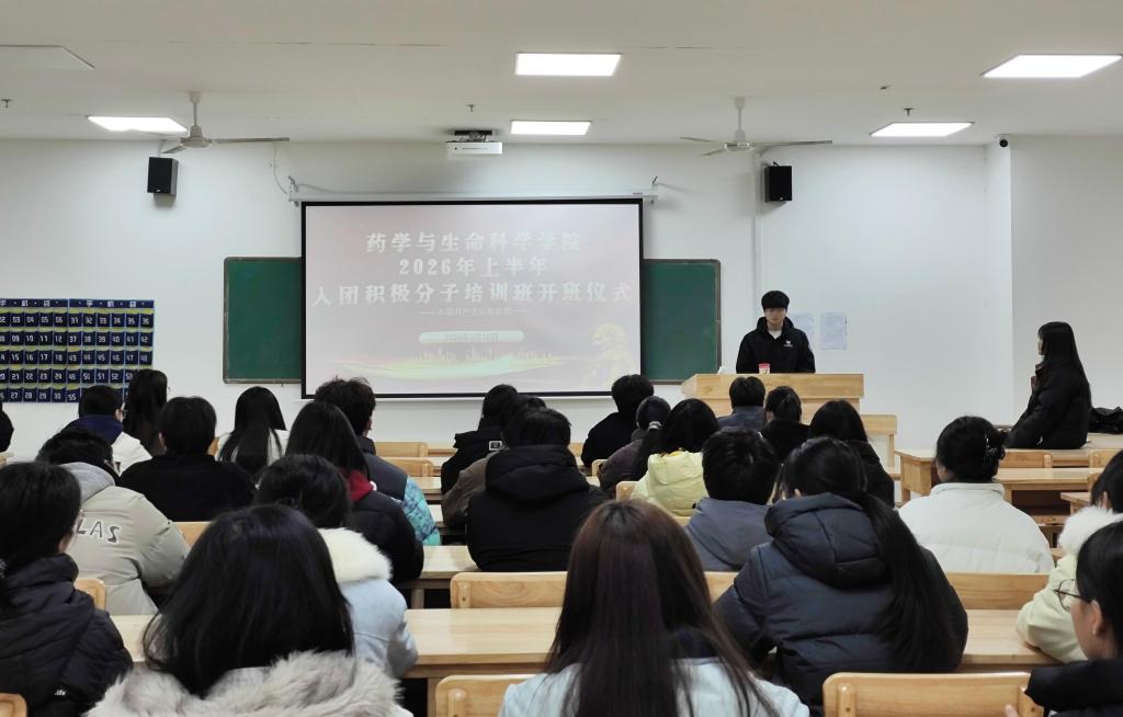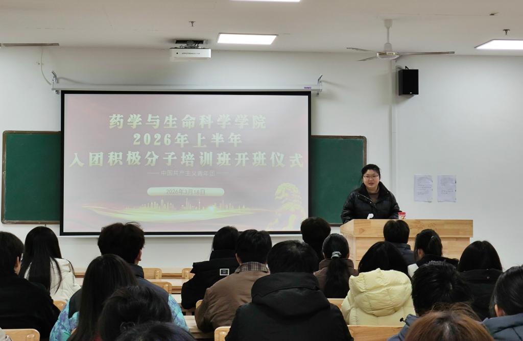 为加强共青团组织建设,培育有理想、敢担当、能吃苦、肯奋斗的新时代青年,为团组织注入新鲜活力,2026 年 3 月 18 日,九江学院药学与生命科学学院 2026 年上半年入团积极分子培训班(暨药学与生命科学学院团校第5期入团积极分子培训班)开班仪式隆重举行。学院学生党支部书记、团委书记、思政科科长陈慧君老师出席仪式,全体入团积极分子参与,仪式由黄鑫主持。